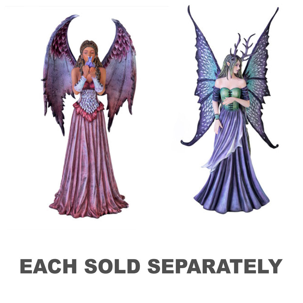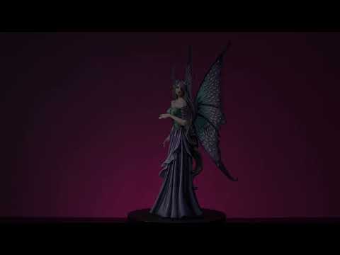 Figura de una elegante hada morada que mira con amor a un dragón bebé. Ella usa un corsé adornado con plumas y un vestido morado fluido para que coincida con sus brillantes alas moradas. Escultura detallada y pintura con texturas realistas.