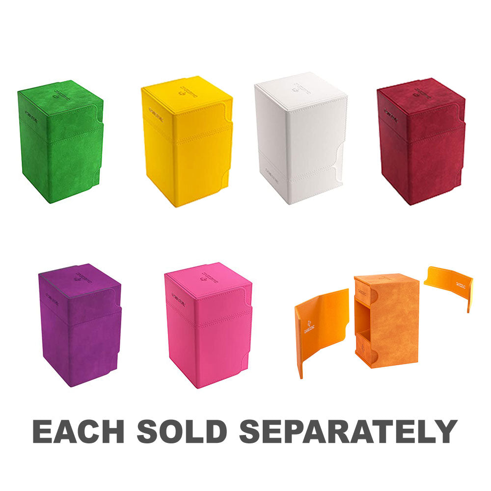 La torre de vigilancia convertible combina caja de cubierta, cajón de accesorios y soporte de cartas en una caja elegante. El soporte de la tarjeta puede mantener hasta 100 tarjetas de doble manga, protegidas por un revestimiento de microfibra interno suave. El cajón de accesorios es perfecto para albergar dados, fichas y otros artículos pequeños.