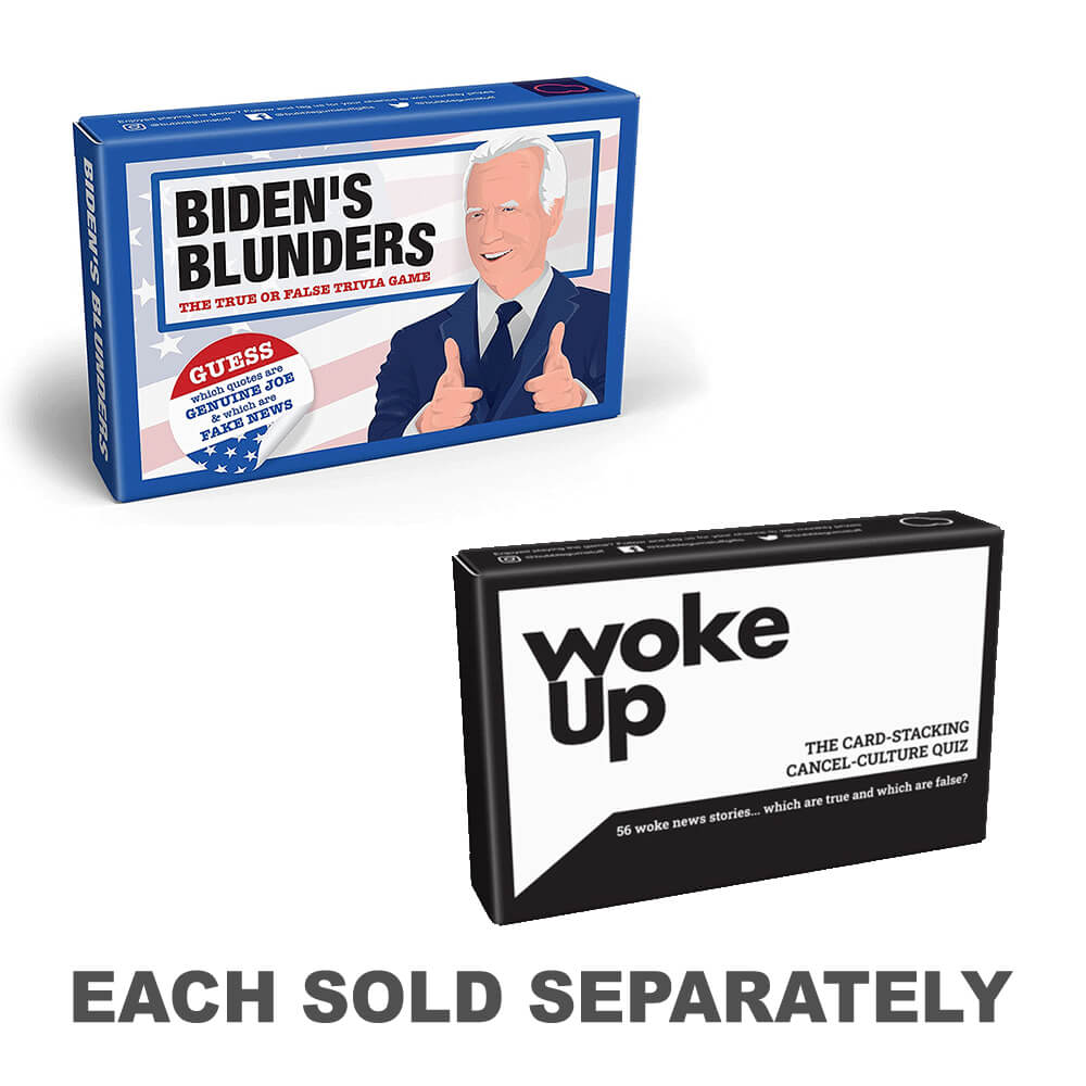 Separe la verdad de las mentiras en este juego de noticias falsas para fiestas presidenciales para personas que aman las trivias basadas en citas políticamente incorrectas. La mitad de las tarjetas contienen declaraciones tontas del somnoliento Joe Biden, y la otra mitad contiene citas de otras fuentes propensas a cometer errores... Es su trabajo averiguar cuáles dijo el presidente y cuáles no dijo. Y dado que este hombre no es ajeno a los errores verbales, este juego es tan complicado como impactante. Biden's Blunders es un juego de cartas simple que supera su peso en términos de diversión. ¡Perfecto para cenas, reuniones y noches de juegos, este juego de fiesta grupal demuestra que realmente es posible dormir hasta llegar a la cima!