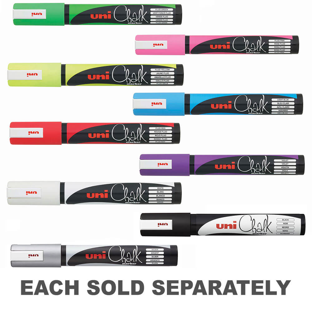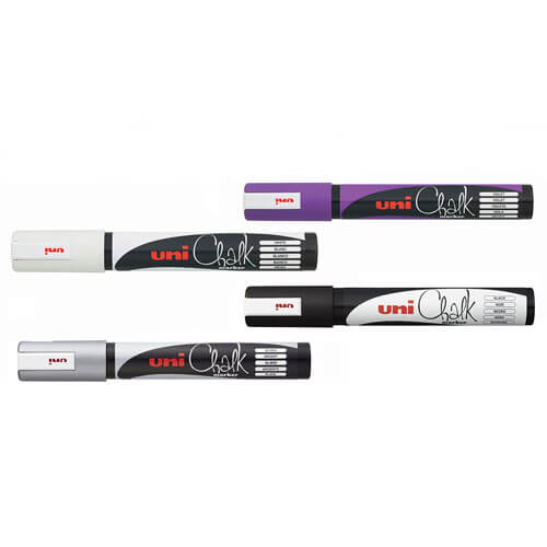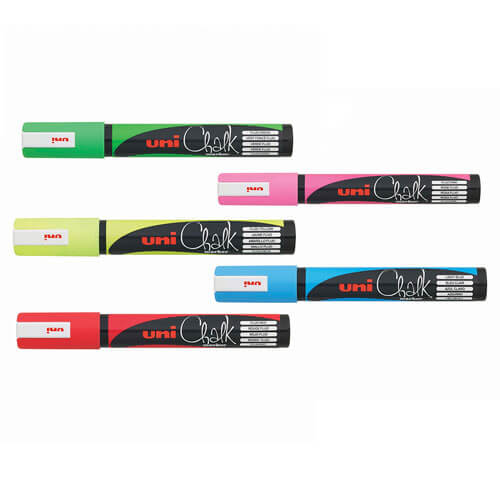 Los marcadores de tiza líquida Uni utilizan tinta pigmentada a base de agua para que puedas marcar en ventanas, vidrio, espejos, superficies de plástico y metal con facilidad. La tinta no se borra con la lluvia, pero es fácil de quitar con un paño húmedo. Para una aplicación permanente, los marcadores también se pueden usar en pizarras para lograr una declaración audaz.