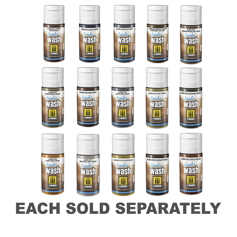 Los lavados son una de las técnicas de modelado más antiguas y esenciales, utilizadas por todos los modeladores en sujetos y dioramas de todo tipo y temas. Desarrollado con dos formulaciones diferentes para incluir tanto el tipo de esmalte como el tipo acrílico. Cada tipo presenta diferentes cualidades para adaptarse a la variedad de necesidades de nuestros modelos y las preferencias de la demanda de cada modelador. Ambos ofrecen excelentes resultados y son muy fáciles de aplicar. La ventaja del lavado acrílico es que no tiene toxicidad u olor, por lo que usarlo en casa o cerca de su familia no es un problema, y se seca más rápido que el lavado de esmalte que le permite terminar el proceso en una cantidad más corta de tiempo valorado . El lavado acrílico viene en una botella con una tapa de dosificación que le permite colocar algunas gotas en una paleta o contenedor para su uso posterior. Aunque la capacidad de la botella es de 15 ml, el dispensador le permite ahorrar productos y trabajar con más precisión