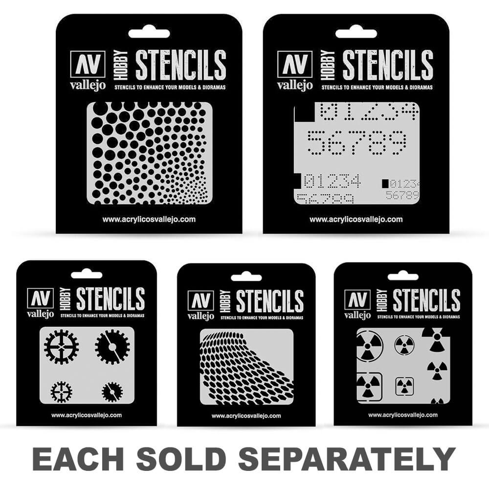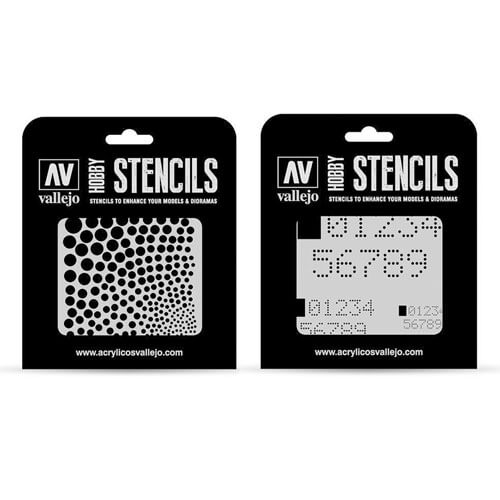 Vallejo Stencils ofrece una amplia selección de referencias y temas para modelistas y artesanos. Disponibles en varias categorías: Marcas AFV: Insignias, números, lemas, señales, marcas de unidad y nacionalidad diseñadas para vehículos blindados históricos y modernos. Camuflajes: Patrones para camuflajes de vehículos blindados y aviones; Disponible en varias escalas. Marcas Aéreas: Insignias, números, marcas de unidad y nacionalidad, registros y efectos de superficie diseñados para aeronaves históricas y modernas. Lettering & Signs: Señales de tráfico, tipografías y rótulos para dioramas, anuncios, rótulos de comercio minorista y graffities. Ciencia ficción y fantasía: insignias, números, efectos, paneles y patrones diseñados para vehículos y naves espaciales de ciencia ficción. Efectos de textura: salpicaduras, texturas, grietas, manchas y otras texturas y efectos físicos.
