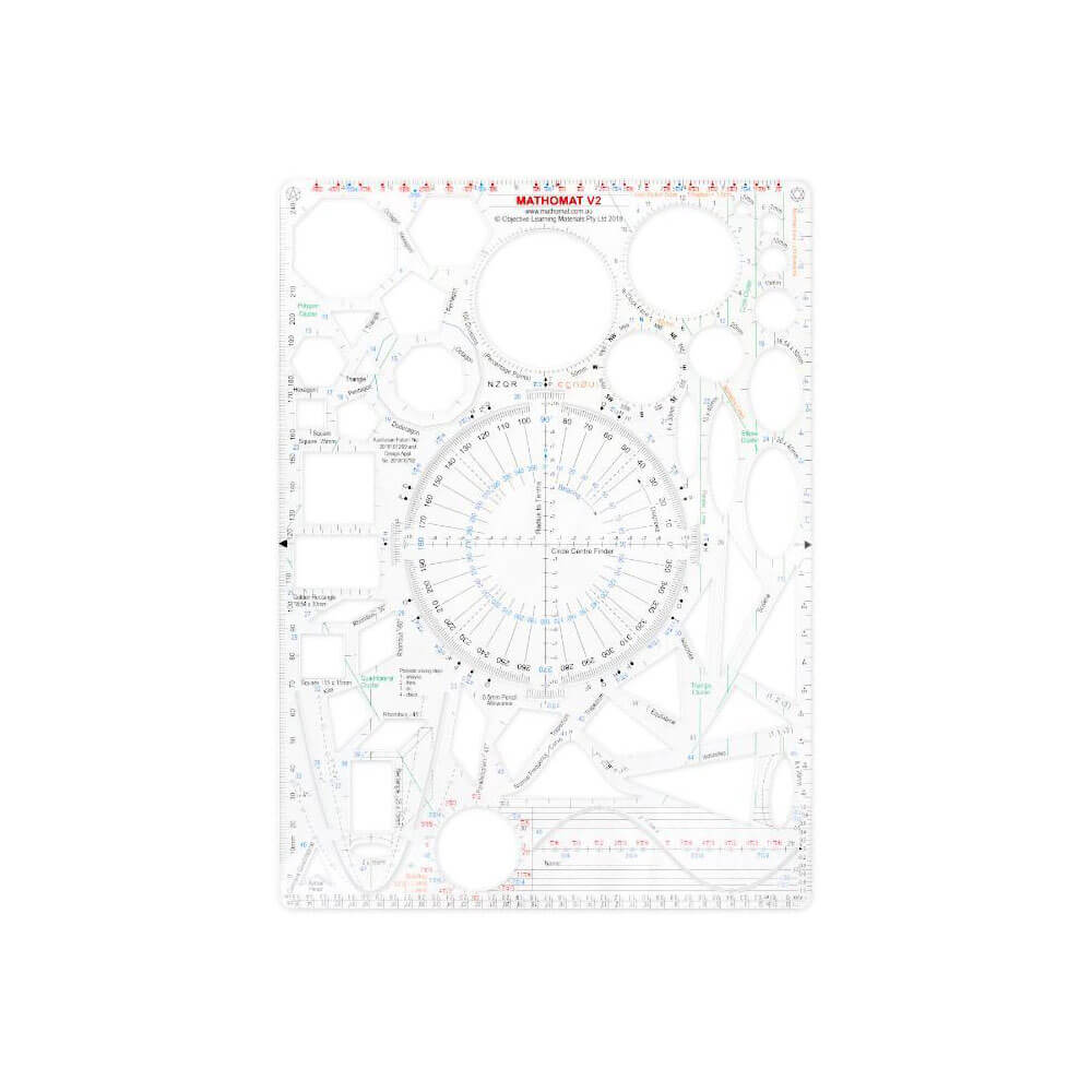 Mathomat -skabeloner kombinerer mange værktøjer til et enkelt instrument; Lineal, Protractor, Compass erstatter cirkler, mange talelinjer og geometriske former stencils, ellipse -skabeloner, grafguider og trigonometrisk funktionsmaskine.