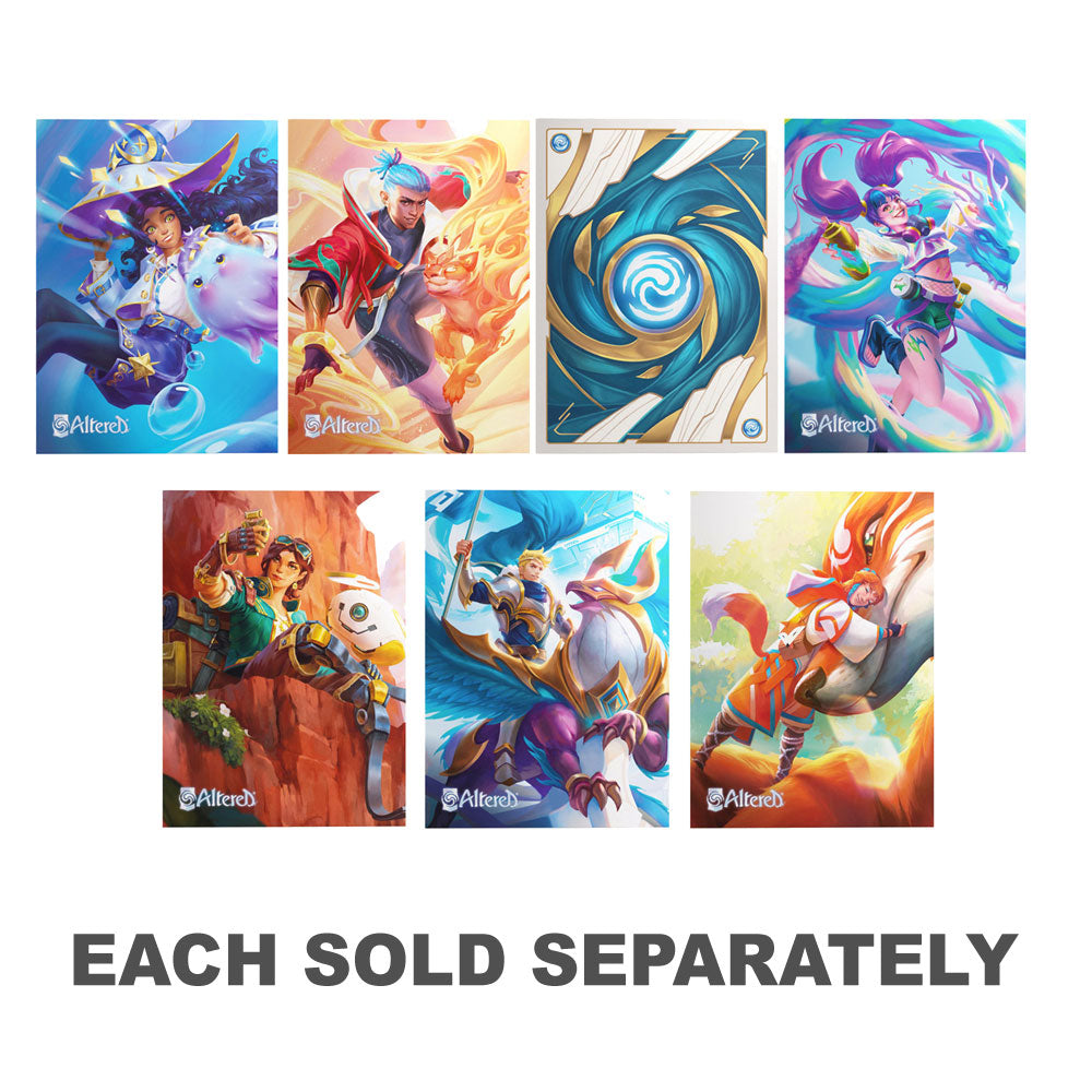 These officially licensed Art Sleeves for the anticipated TCG Altered protect up to 50 standard-sized gaming cards. The sleeves are full-color printed and come in seven amazing eye-catching designs - six of them representing each faction. The durable and robust Art Sleeves provide a great shuffle feel and a comfortable haptic experience. They are optimized for Altered as well as a vast variety of TCGs and LCGs. The Altered Art Sleeves can also be used for all standard-sized card games. One pack contains 50 Art Sleeves.