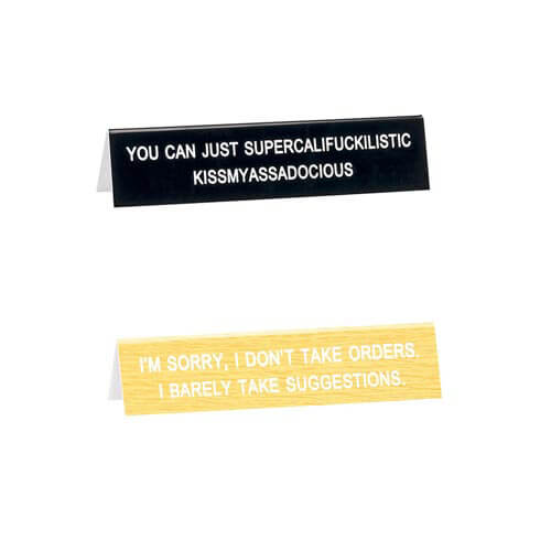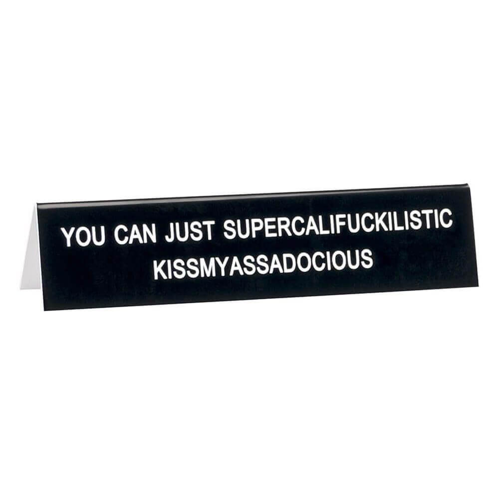 Brechen Sie die Monotonie der Arbeit auf und bringen Sie ein paar LOLs ins Büro mit diesem schwarzen Schreibtischschild von SAY WHAT?. Die Bildunterschrift lautet: „You Can Just Supercalifuckilistic Kissmyassadocious“. Das Produkt misst 14,5 cm x 3,5 cm.
