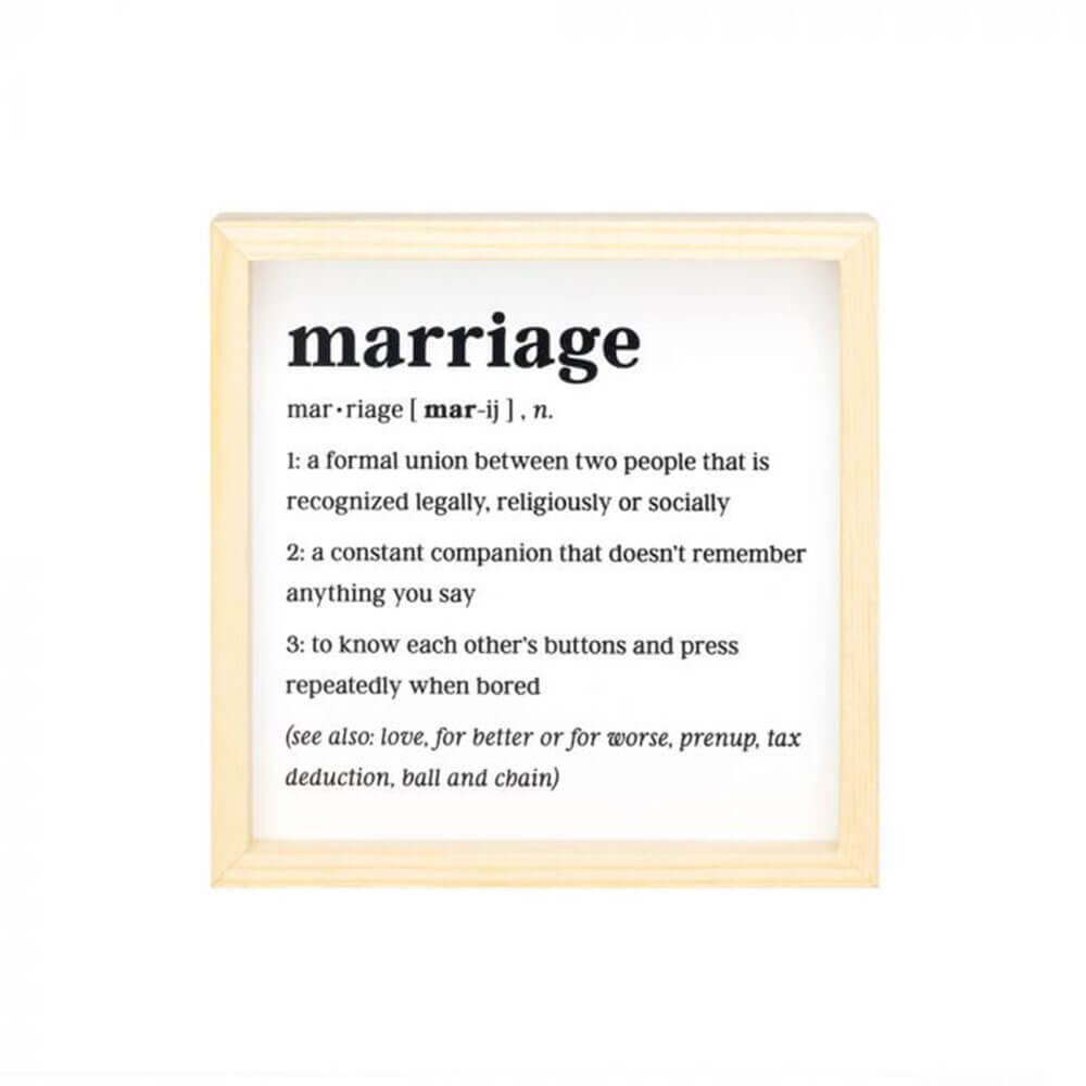 - Caption featured on framed art is a witty take on an original definition of marriage