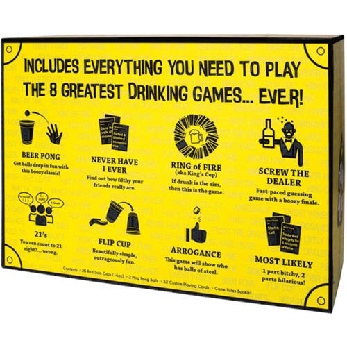 Proven crowd-pleasers such as Beer Pong, Ring of Fire, I Have Never and Flip Cup will keep the party going all night and you'll still have plenty more games to play the following weekend.