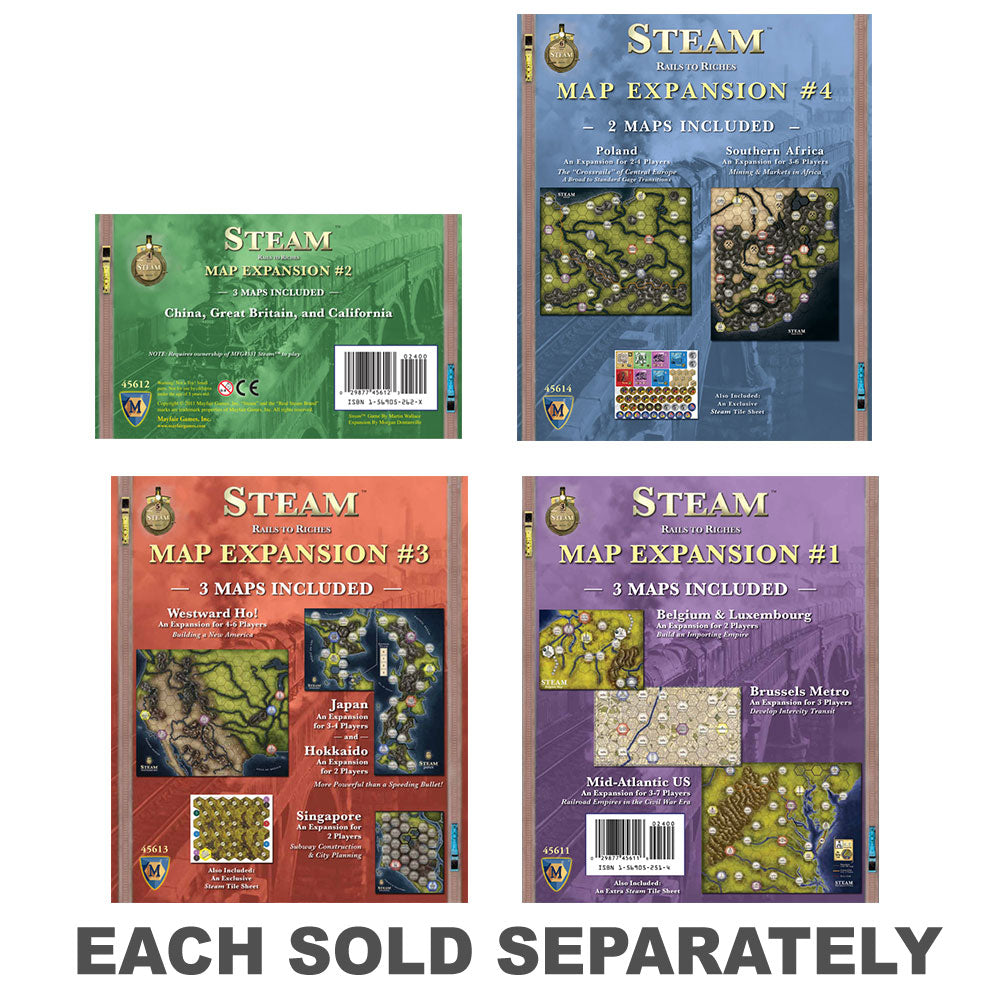 La primera de las expansiones de Mayfair para Steam. ¡Triple Play ofrece tres pistas en el mismo paquete! Un lado tiene un mapa de los Estados Unidos del Atlántico Medio. El otro lado tiene dos mapas: Bélgica y Luxemburgo y el Metro de Bruselas. Estos tableros seguramente desafiarán a los jugadores de Steams con sus reglas específicas de la región y su topografía desafiante. Componentes