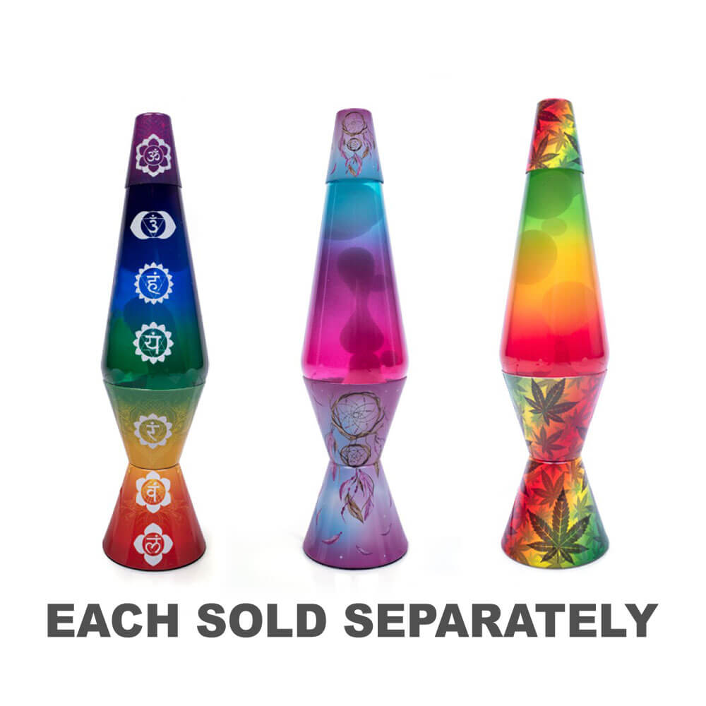 • Cuenta con un cuerpo de vidrio degradado de arcoíris lleno de lava que se arremolina y ondula cuando se enciende .