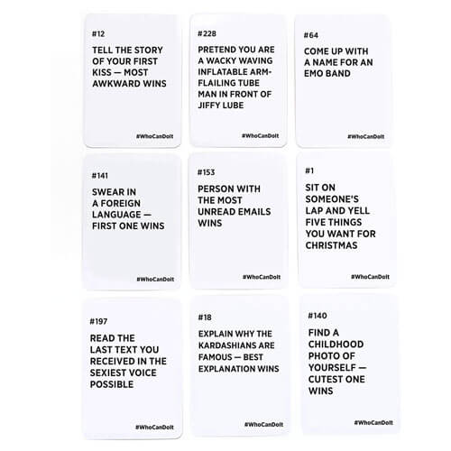¿Quién puede hacerlo ... incluye 250 tarjetas de acción para ver quién en el grupo puede hacerlo! Compite contra sus amigos para hacer la mejor impresión del juez, beba un vaso de agua con una cuchara y cambie el fondo de su teléfono a una foto de un hombre calvo.