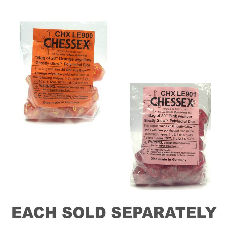 • Sac de 20 Dice polyédrique Ghostly Glow - Orange avec des nombres jaunes
