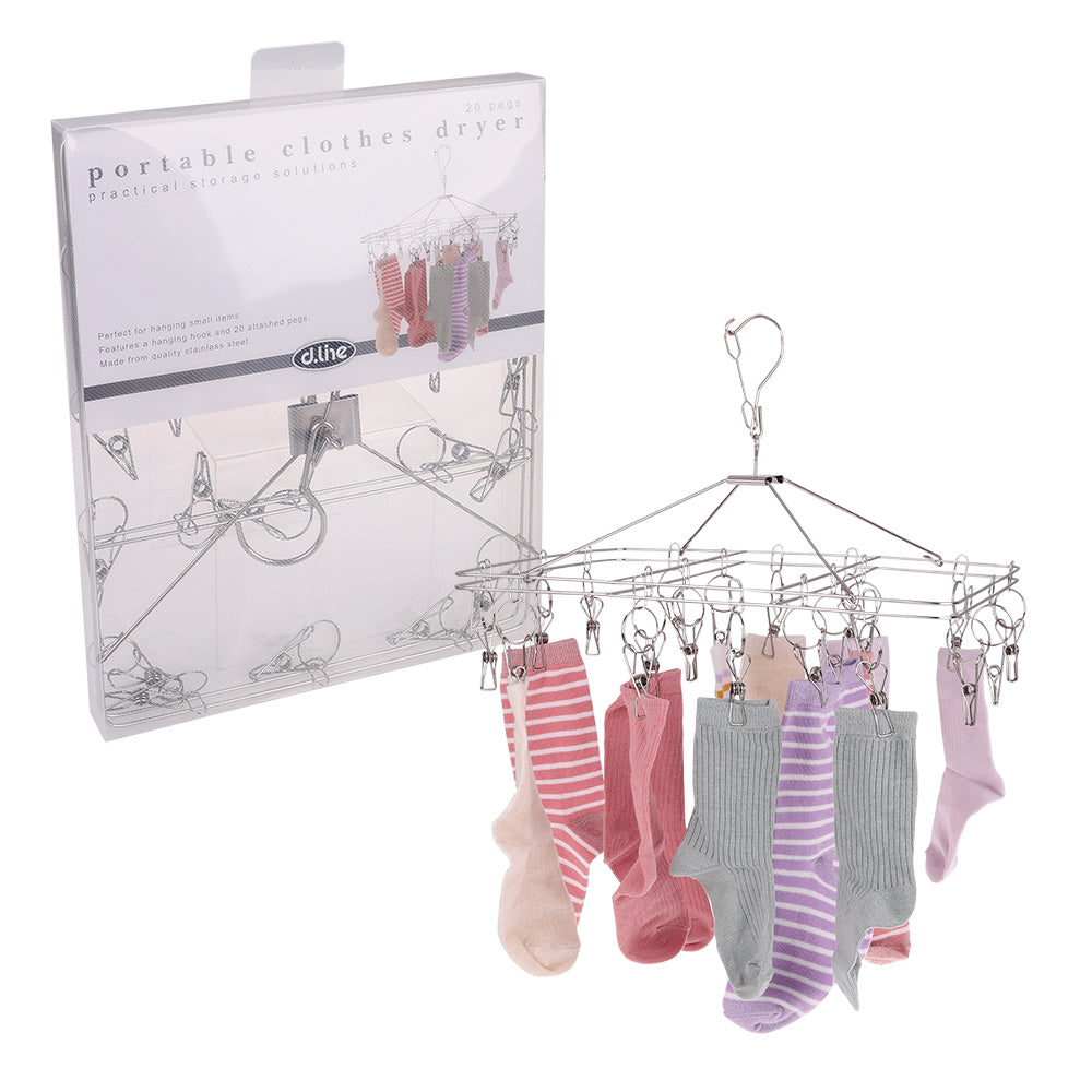 このステンレス鋼の長方形の衣類乾燥機-D.Lineからの20ペグは、最もコンパクトなスペースであっても、小さなアイテムを吊るすのに最適です。吊り下げフックと20個の接続されたペグを備えたこのコンパクトドライヤーは、移動に最適で、簡単に保管できるように折りたたみます。