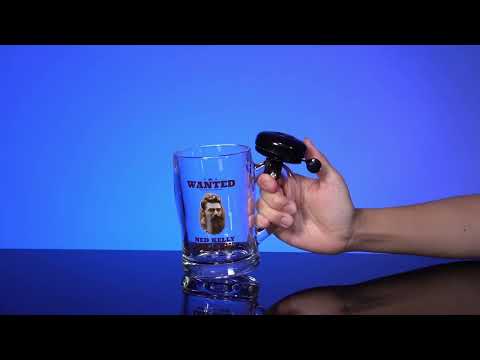 ハンドルに黒い鐘が付いたガラスビールマグカップ - 別の飲み物の時間になったら鳴らしてください!オーストラリアのアイコンNed KellyのWantedポスターが特徴です。常にグラスをいっぱいに保つのに最適です!