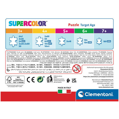 60ピースの完成したジグソーパズルパズルのサイズの子供用ジグソーパズル:33,5 x 23,5 cm、子供向けに特別に設計されたジグソーパズルのパズルの広大な配列と、観察力と論理的およびマニュアルスキルを磨くのに役立ちます。活気に満ちた魅力的な色で魅惑的な画像は、友人や家族と何時間もの楽しみのために子供たちの最も愛されているキャラクターを描いています。環境意識の重要性に鋭く調整されたクレメントーニは、リサイクル材料を広範囲に使用し、汚染物質を含むコンポーネントを回避します。イタリア製。