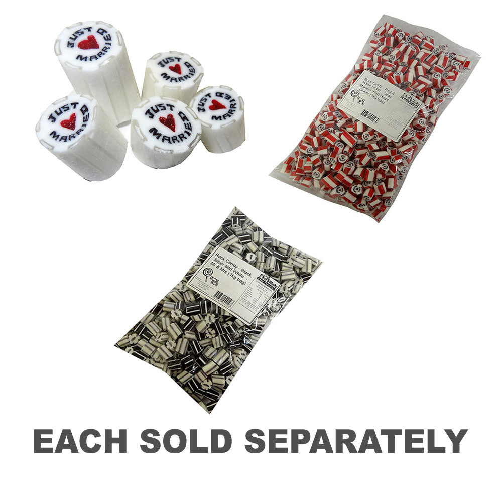 • Wedding Bliss: Deze rock snoepjes tonen een hartverwarmende "gewoon getrouwde" boodschap naast heerlijke rode harten, die de liefde en het geluk van de pasgetrouwden symboliseert.