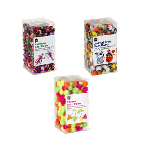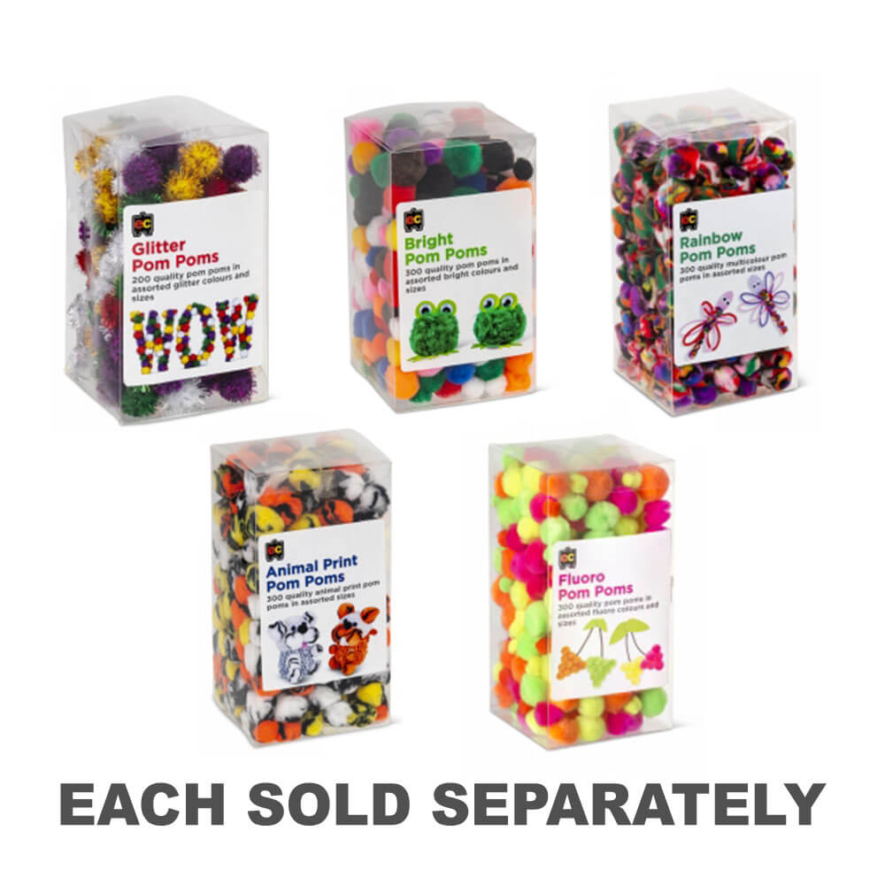 Pom Poms er morsomme for mange listige ting, lage julestrømper eller bare leke med dem. Disse glitrende og fluffy pom poms vil gi en 3D -effekt til enhver håndverksaktivitet. Assorterte glitterfarger og størrelser i en boks på 200.