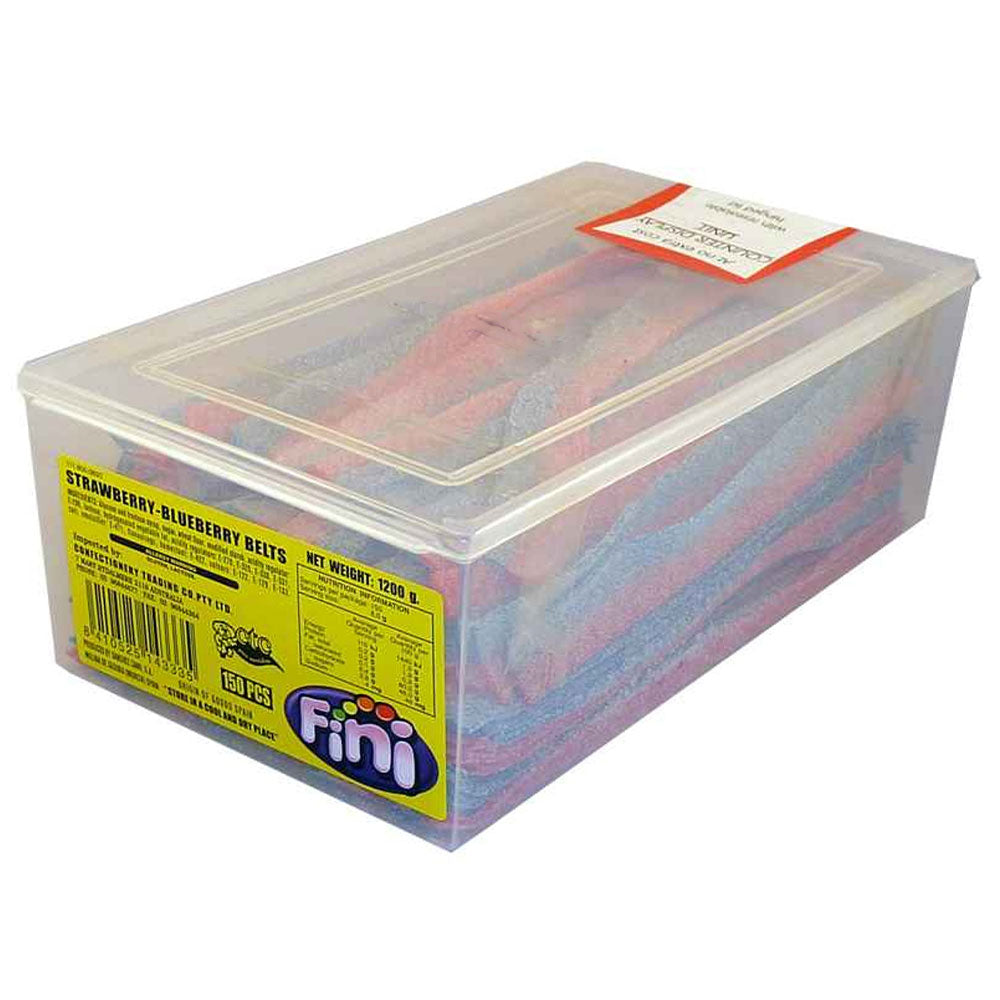 Fini jordbær- og blåbærbelter er en deilig godteri -godteri som kombinerer de søte og saftige smakene av jordbær og blåbær. Disse godteribeltene har typisk et pulserende rødt og blått fargeskjema, som representerer de to fruktige smakene. Den seige strukturen og den herlige blandingen av jordbær- og blåbærsmaker gjør dem til et populært valg for de som liker en fruktig og seig godteriopplevelse.