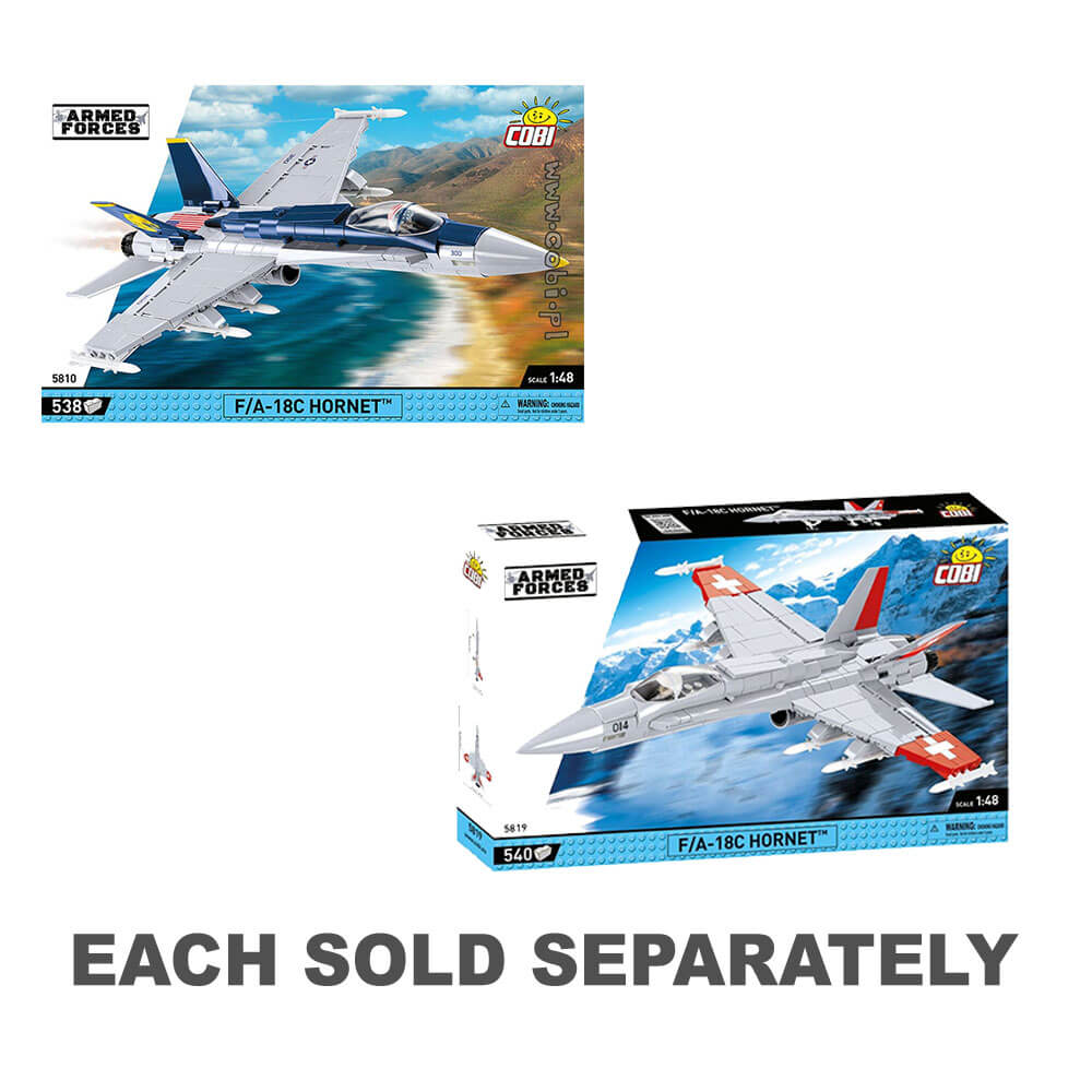F/A-18C Hornet to unikalny model myśliwca z wieloma rolami w kolorach Szwajcarii. Samolot przygotowano w modelu skali 1:48 przy użyciu bloków konstrukcyjnych 540 COBI. Zestaw obejmuje wysokiej jakości wydruki naśladujące malowanie oryginalnego samolotu. Model jest wyposażony w składane podwozie i obrotowe koła. Pod skrzydłami znajduje się duży arsenał broni. W kabinie możesz umieścić specjalną postać pilota. Zestaw zawiera również stojak na wyświetlacz blokowy i płytkę o nazwie samolotu. Ten ekskluzywny, licencjonowany zestaw jest skierowany do wszystkich, niezależnie od wieku, w tym fanów lotnictwa i wojskowych. Samolot wygląda równie atrakcyjnie w biurze lub w pokoju nastolatka.