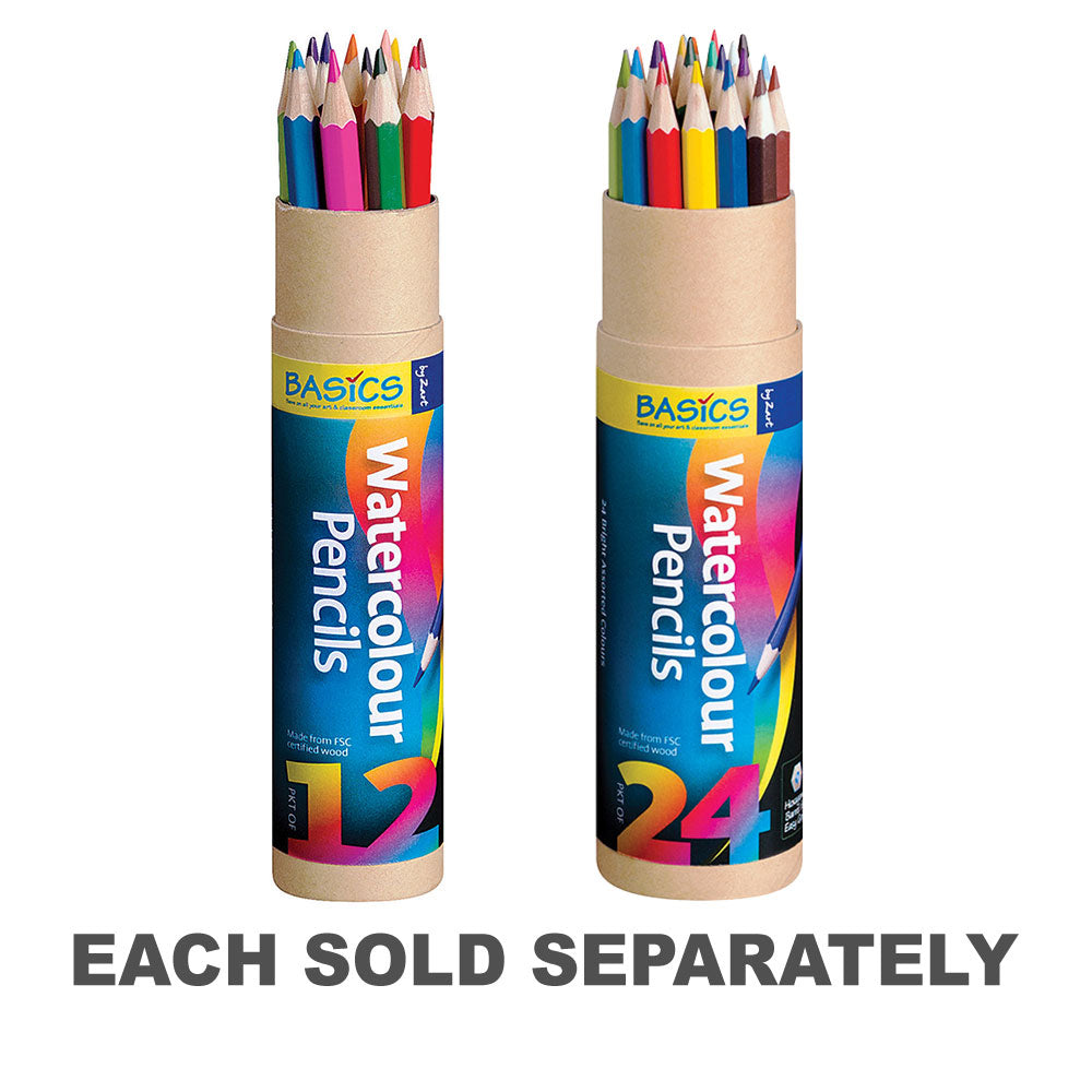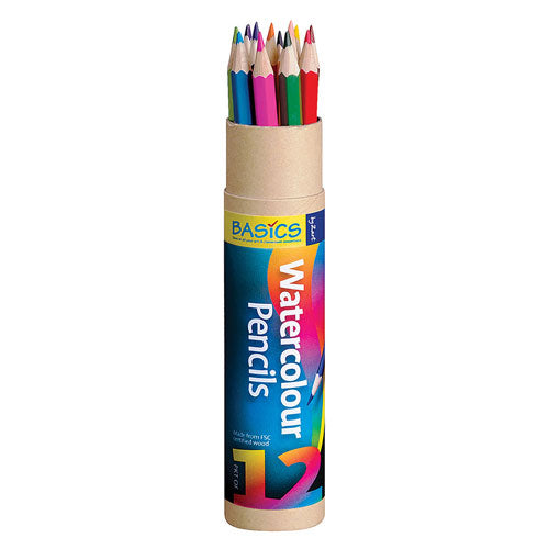 The Basics Watercolour Pencils 12's, a versatile and vibrant set of watercolour pencils perfect for school or home use. These 12 assorted pencils produce rich colours that blend effortlessly, allowing you to create stunning watercolour effects in your artwork.