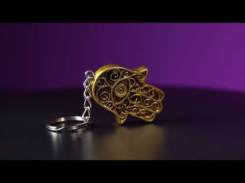 El llavero hamsa pintados a mano místicos. Cuenta con un intrincado diseño de hamsa con un acabado metálico en un anillo de llavero tradicional.