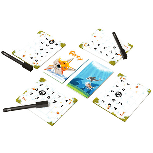 To set up, shuffle 19 of the 40 cards into a deck, then shuffle the fox card into this deck. Each player takes a dry erase board and a marker. Flip the top card; for the types of animals depicted on this card, everyone secretly writes the total number of animals of these types that they've seen on all cards revealed so far. For the first round, this is easy — write the number of animals on this card! But you'll start seeing cards of many environments, and wait, how many chickens have I seen so far? How many cats? You can write only a single numeral for each round, with no reminders of which animals were which. When the fox card appears, write a numeral showing how many different animals you've seen total. Once during the game, you can circle a number to take a chance on doubling that score.