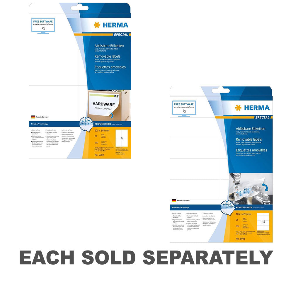 Organize and categorize with precision using Herma Removable Labels! This pack includes 25 A4-sized labels in white, each measuring 105mm in length, featuring a removable adhesive backing for convenient repositioning or removal. Whether for temporary labeling needs, file updates, or organizational changes, these removable labels offer versatility and flexibility. With a strong adhesive that ensures secure attachment yet allows for clean removal, these labels provide convenience and efficiency for all your labeling needs. Get ready to streamline your organization with Herma Removable Labels!