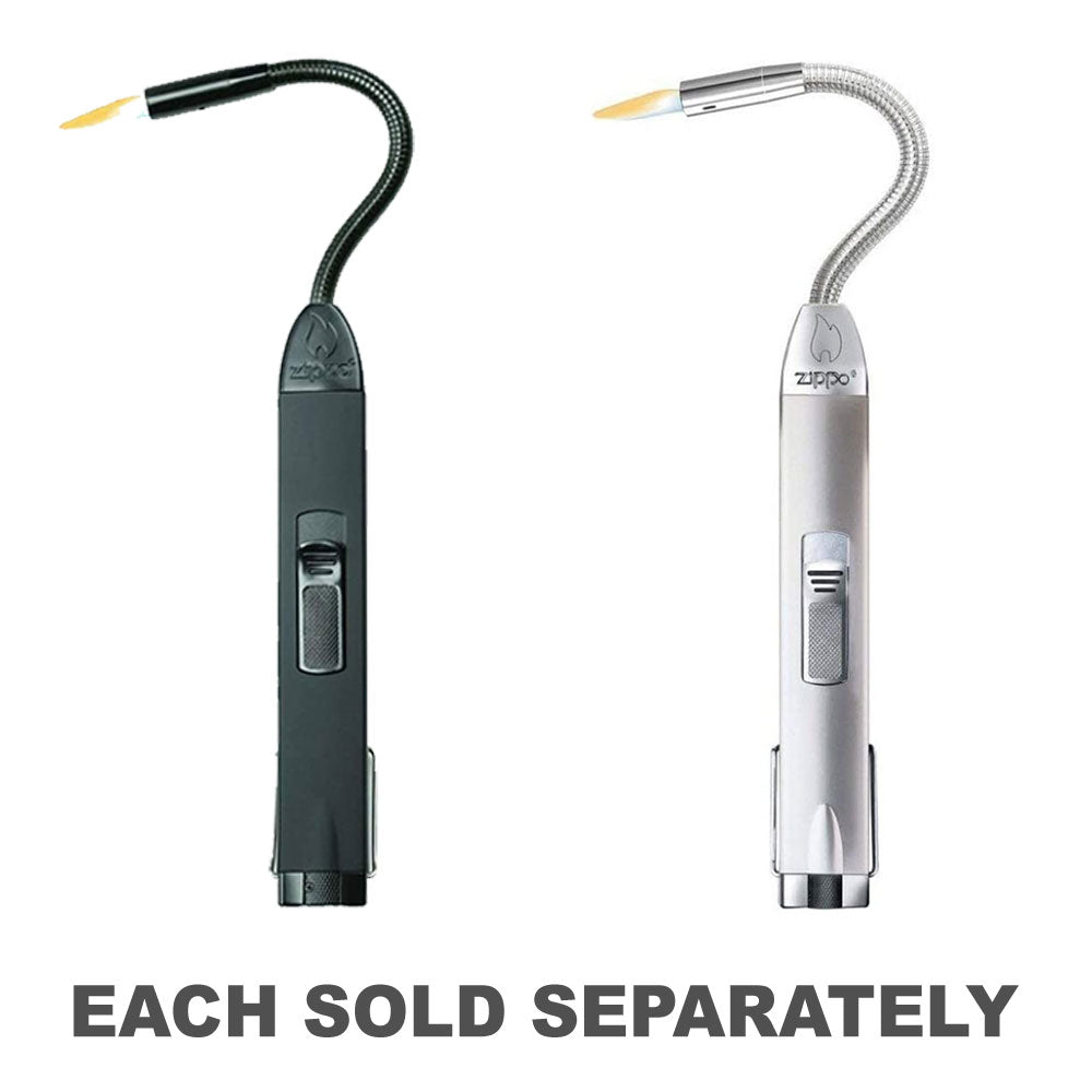 El encendedor utilitario para exteriores Zippo con cuello flexible está construido en aluminio negro plano con inserciones de goma. Tecnología de doble llama resistente al viento. Cuello extendido flexible, rematado por una boquilla delgada y potente, se adapta fácilmente a todas las aberturas de iluminación. Sistema de encendido avanzado. Indicador de nivel de combustible. Botón de seguridad a prueba de niños patentado con llama ajustable. Lazo para colgar de acero inoxidable. Ideal para acampar, linternas, chimeneas, antorchas tiki, parrillas, fogatas y más. La forma de caja estándar con esquinas redondeadas y parte superior con fondo plano. Una bisagra de cinco cilindros une la parte superior y la inferior. Dispone de inserto estándar con 16 orificios en la chimenea (8 por lado). La parte inferior está estampada con el logotipo Zippo de la época que autentica estos encendedores como Zippo genuinos.