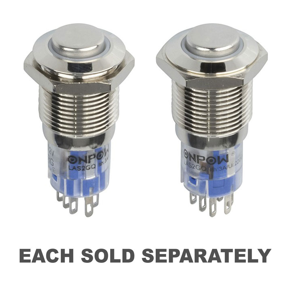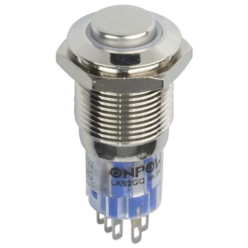 Switch nominal do IP67 para uso industrial ou outros ambientes severos. Dual cor vermelha/verde iluminada, corpo de metal, DPDT, ação momentânea.