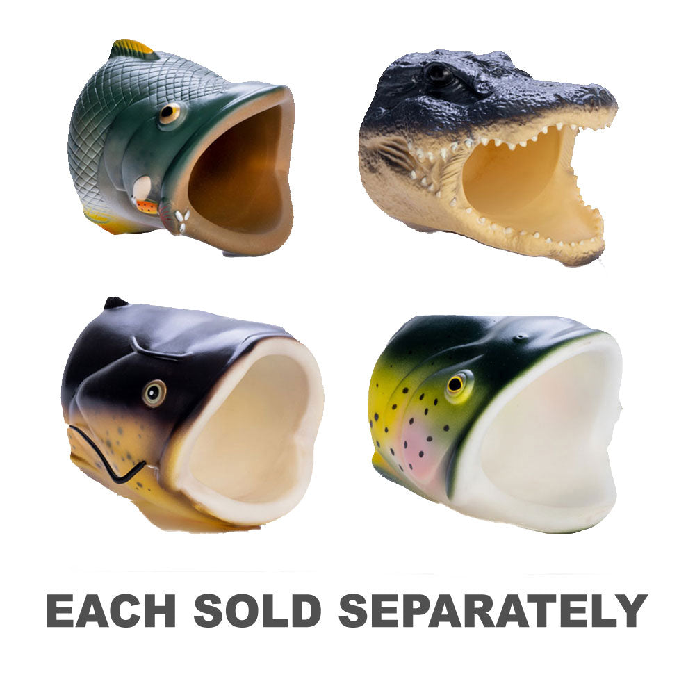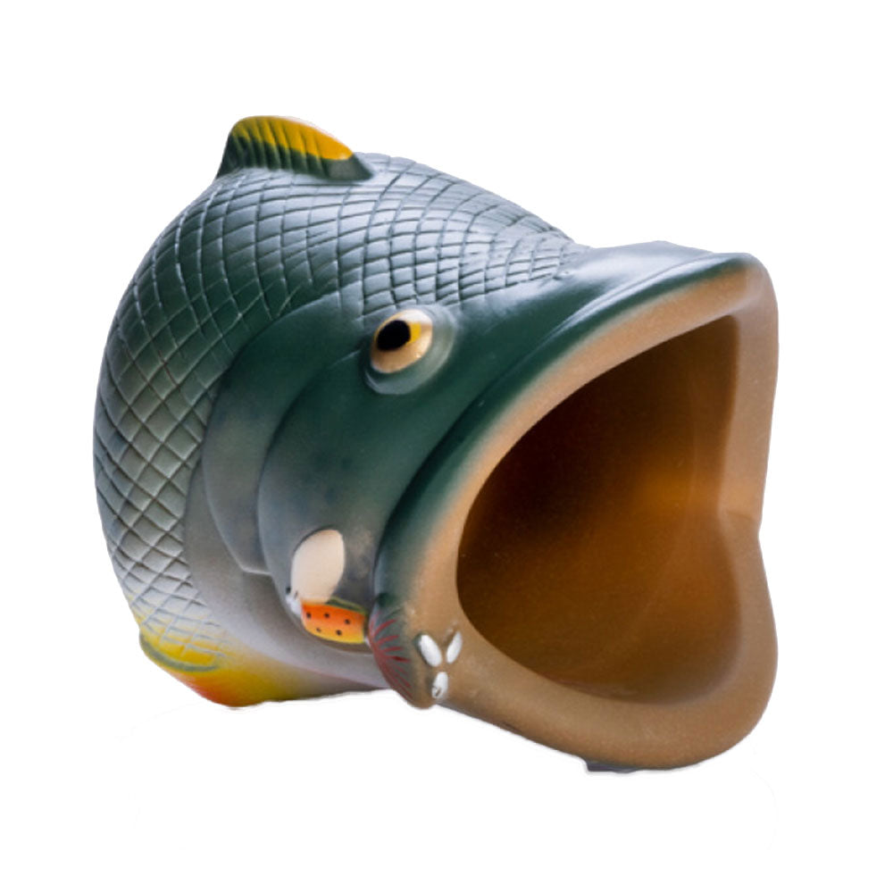 Fin-Tastic Largemouth Bass Can Lan, feito de isolamento de vinil, apresenta textura realista da escala e coloração verde manchada. A novidade pode cooler projetada como se o baixo estivesse engolindo sua bebida!