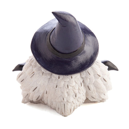 Bedårande familj av snöiga ugglor som bär häxhattar. Fjäderstruktur och svarta flecka detaljer ser ut som det verkliga djuret. Tillverkad av robust polyresin med en lyxig, tung känsla.