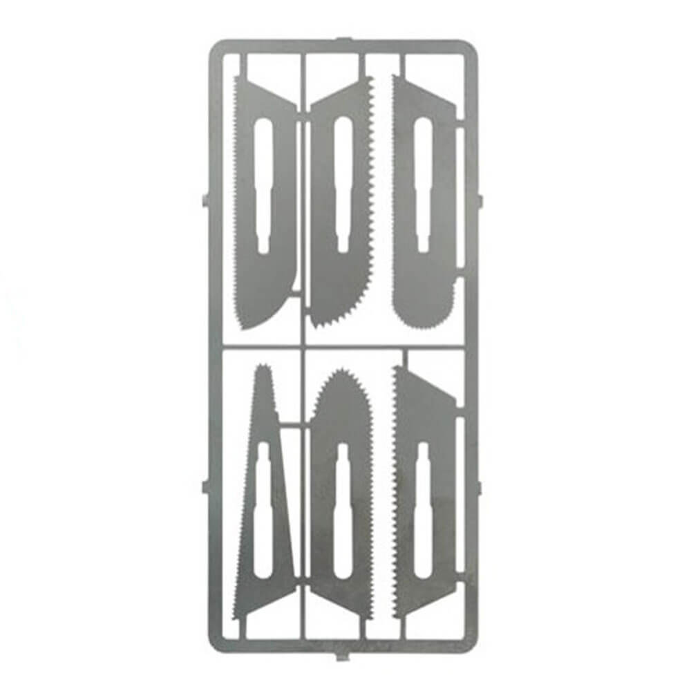 • Uppsättningen innehåller 6 mycket fina sågblad (0,24 mm tjocklek). Utmärkt för intrikat sågning och skärning av plast, trä- och foto -etsade delar. Bladen kan passa alla små föroreningar i skalpellen.